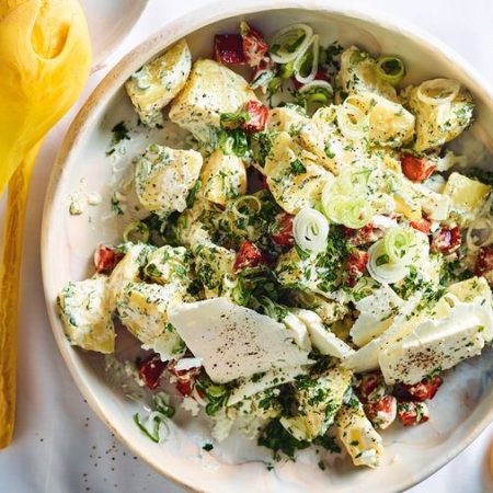 • 3.Combine mayonnaise, sour cream and herbs in a bowl with remaining 1 tbs vinegar. Coat potatoes in mayonnaise dressing and scatter with extra herbs, spring onion, feta and chorizo to serve.