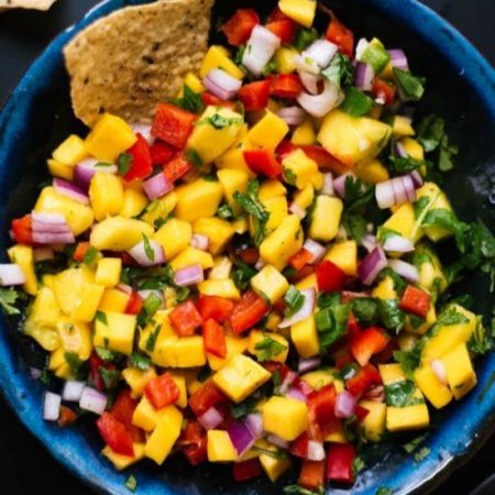 This simple and colourful mango salsa is super easy to make! It’s sweet, spicy and absolutely delicious. Serce this fresh mango salsa with chips, on tacos or salads, or as a salad itself. It’s that good. Recipe yiedls about 3 cups of salsa.